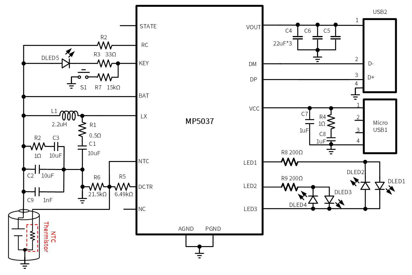 MP5037 is a power bank solution device which is highly integrated with switch charger, LED display cell and synchronous boost output.