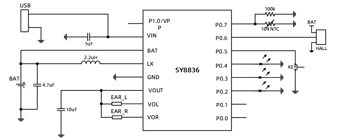 SY8836是專(zhuān)門(mén)為T(mén)WS耳機(jī)充電倉(cāng)設(shè)計(jì)的全集成SoC芯片。SY8836內(nèi)部集成了兼容8051指令集的CPU,256字節(jié)RAM, 4k字節(jié)OTP程序存儲(chǔ)區(qū),多通道10位ADC,9個(gè)GPIO,一個(gè)線(xiàn)性充電模塊,一個(gè)Boost升壓模塊和兩個(gè)獨(dú)立放電控制MOS管。SY8836芯片VIN管腳支持過(guò)壓保護(hù),最高耐壓可達(dá)35V。