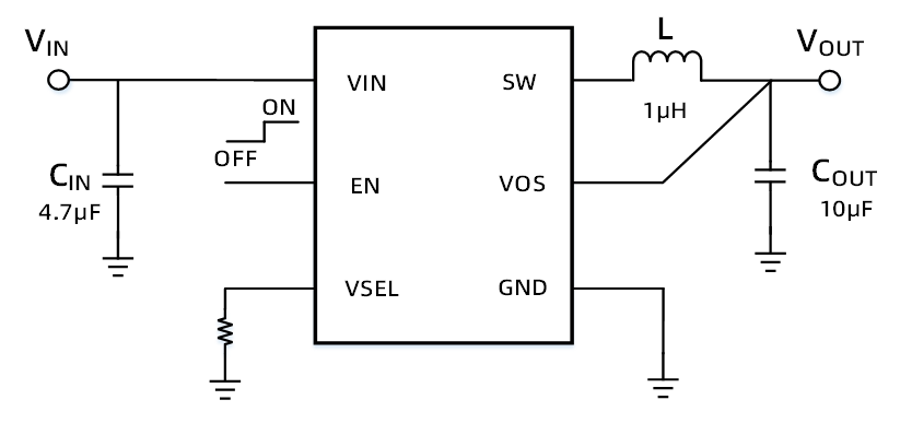 在啟動階段,VSEL引腳的數(shù)字電阻(R2D)感應(yīng)外部電阻以設(shè)置目標(biāo)輸出電壓。共有16檔電壓可選。如果輸入電壓接近輸出電壓,器件便會主動進(jìn)入無紋波100%模式,以防止輸出紋波電壓增大。在100%工作模式下,功率管PMOS管將停止開關(guān)動作,并保持常通。